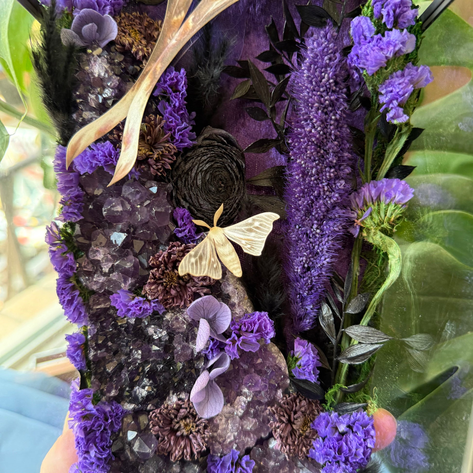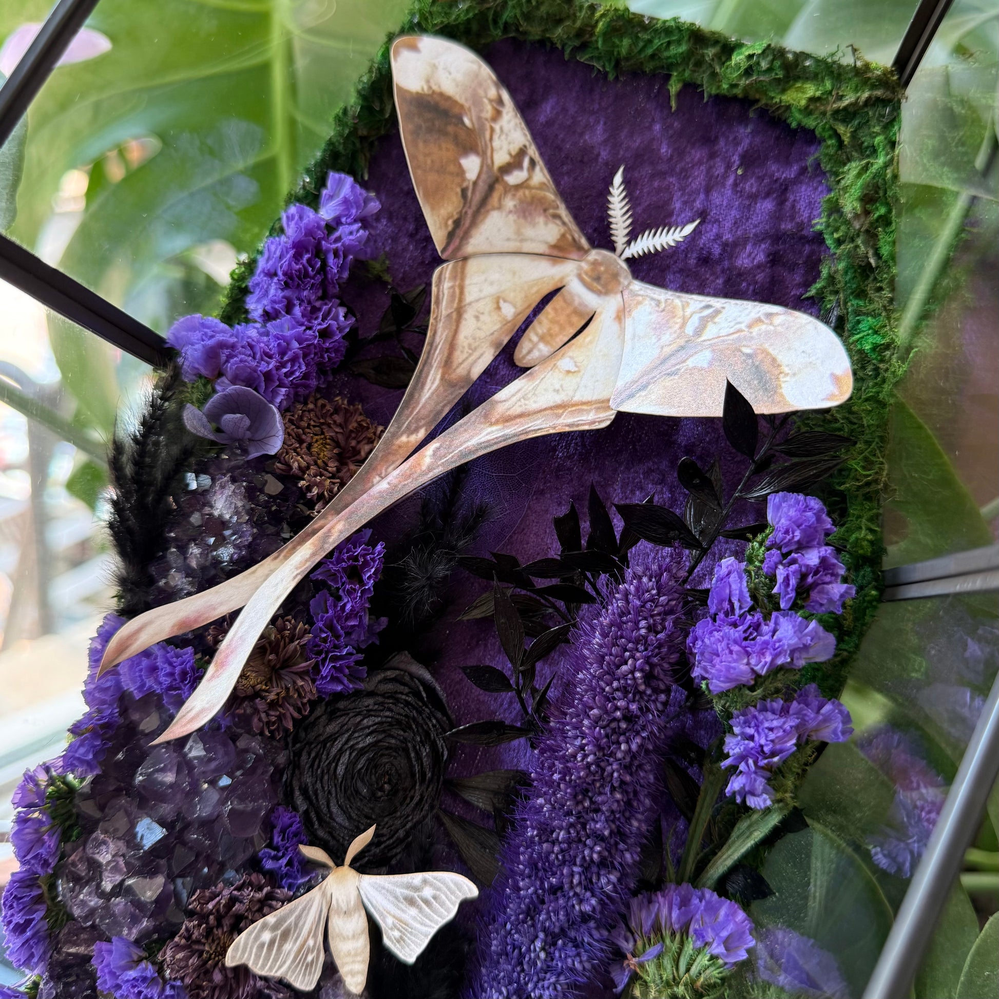 This glass terrarium is lined in purple crushed velvet, and amethyst clusters that glow like haunted starlight. Preserved moss and dried florals weave a forest of shadows, while delicate paper antiquarian moths rest as if caught between worlds. Featuring a paper Long-Tailed Leaf Moth and two paper small silk moths