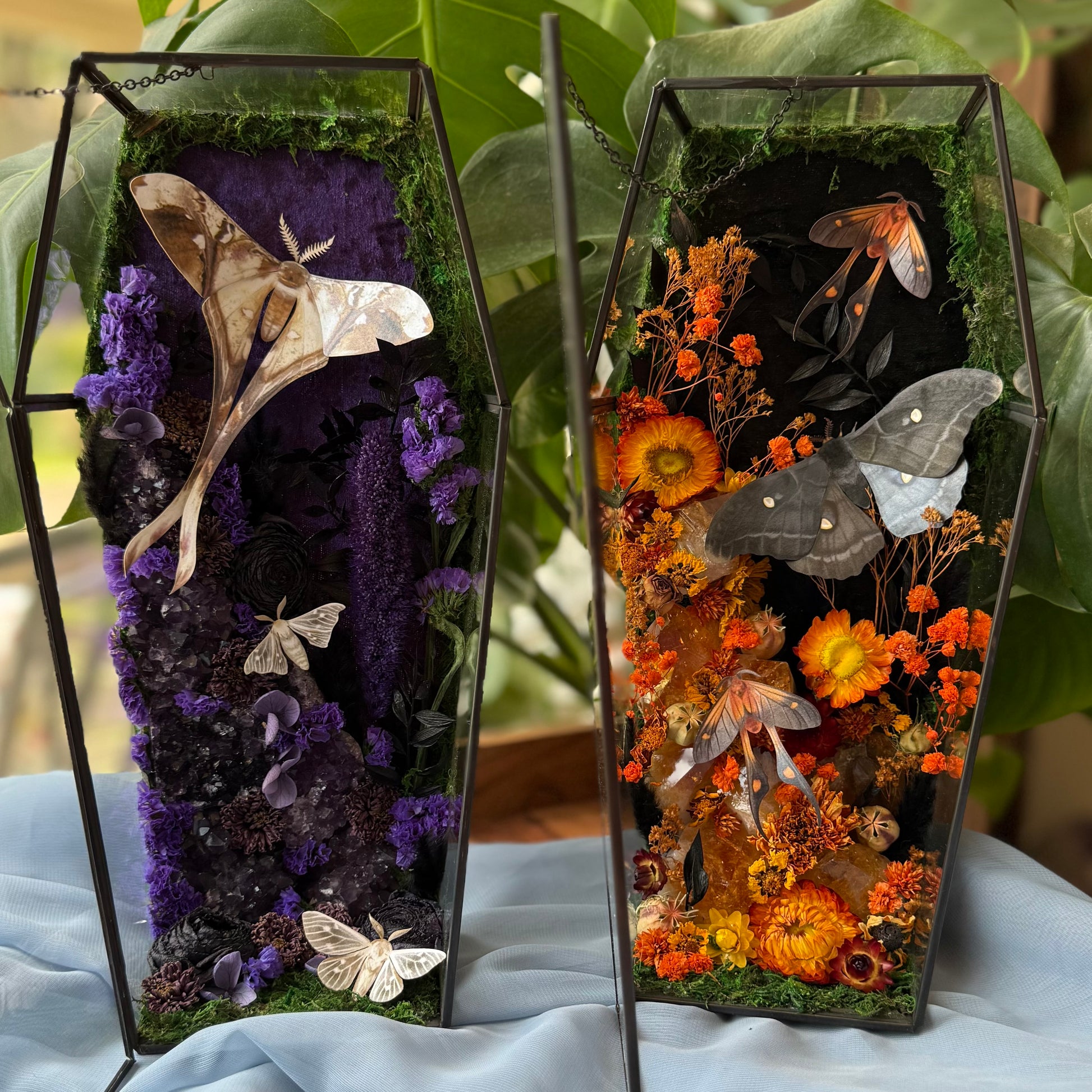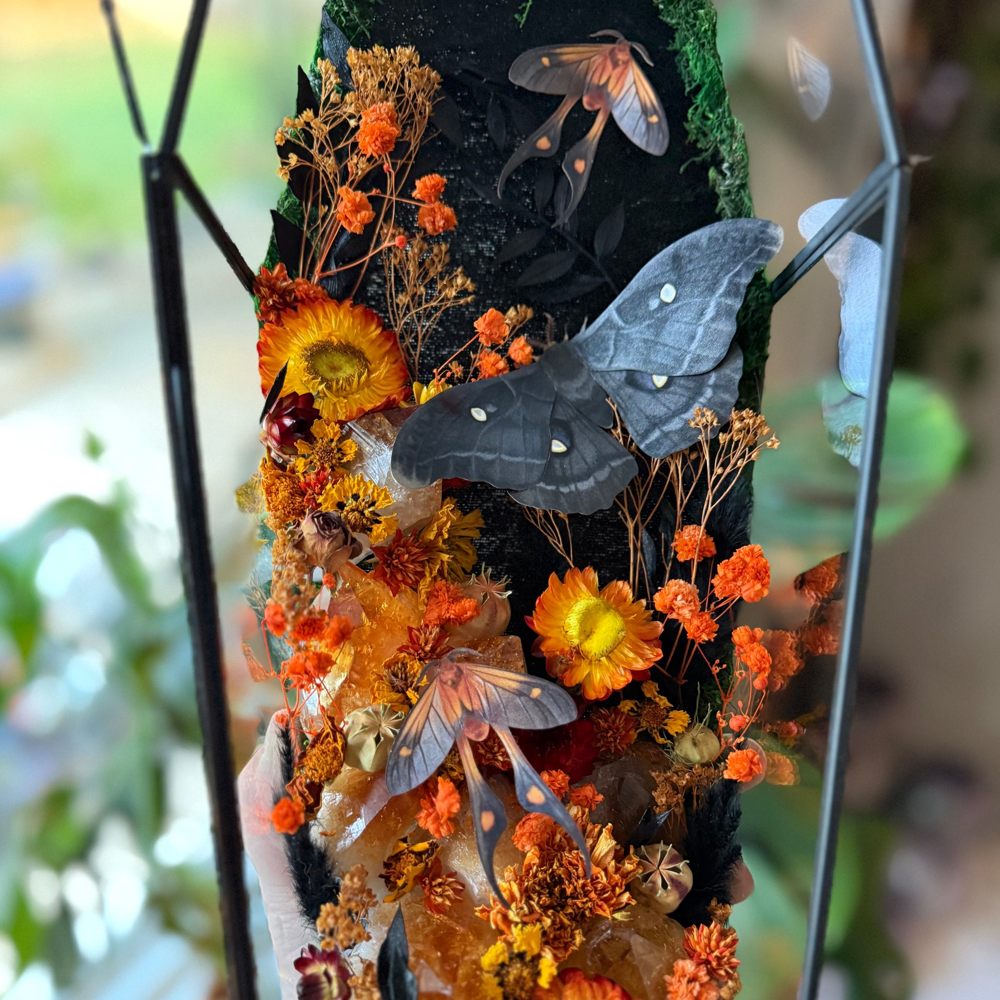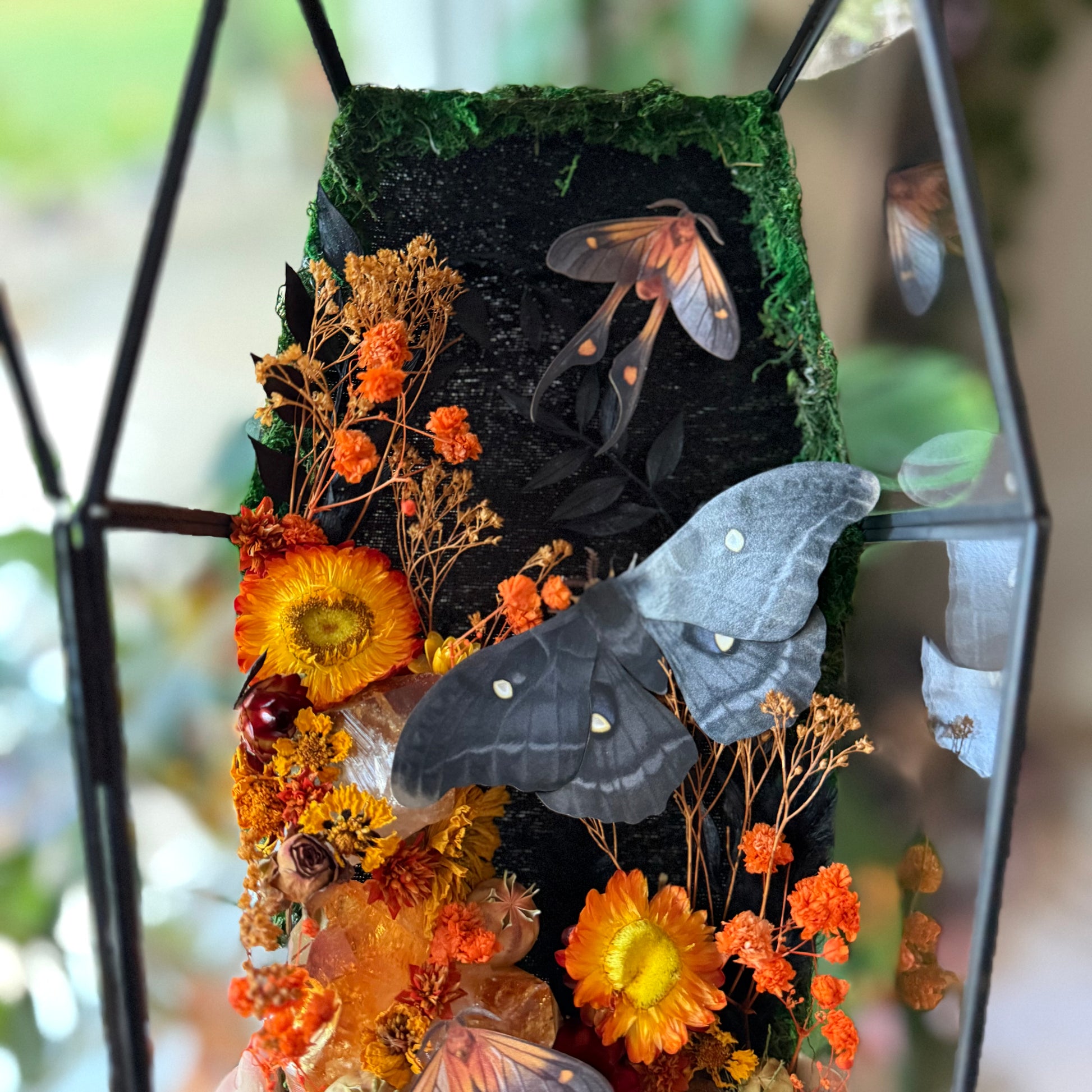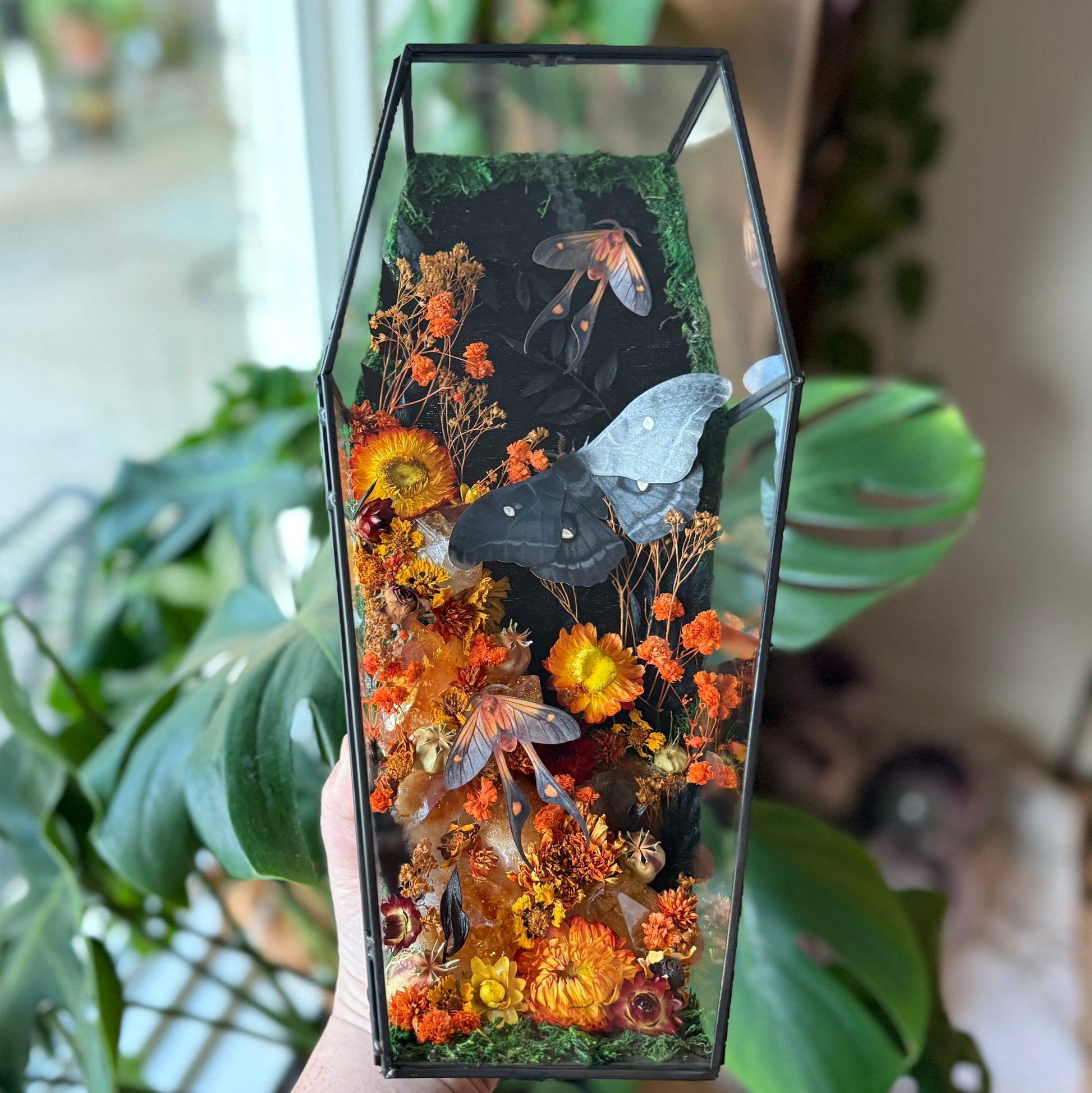 Preserved moss and dried florals tangle into an eternal autumn garden, where a hauntingly beautiful paper Dark Polyphemus moth rests beside two rare Fulveolans long-tailed burnet moths.