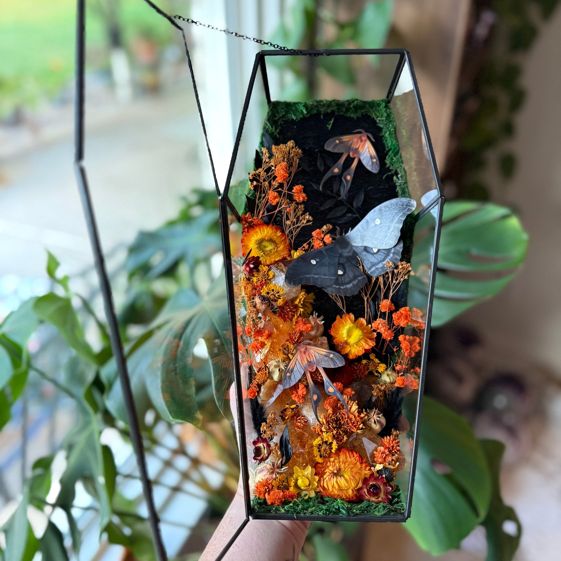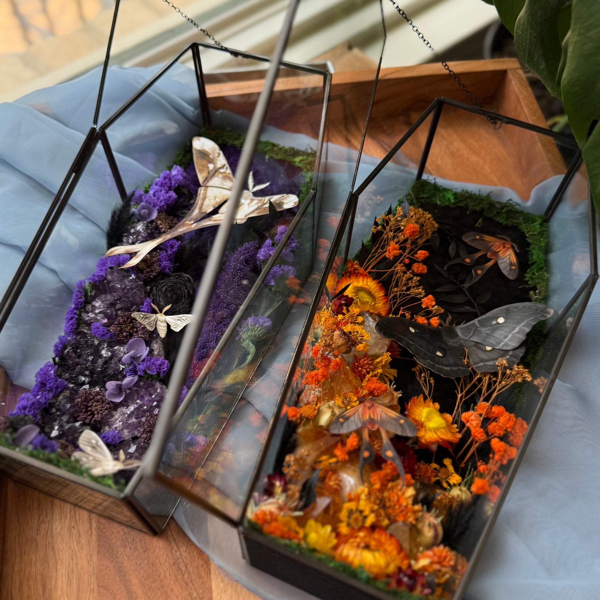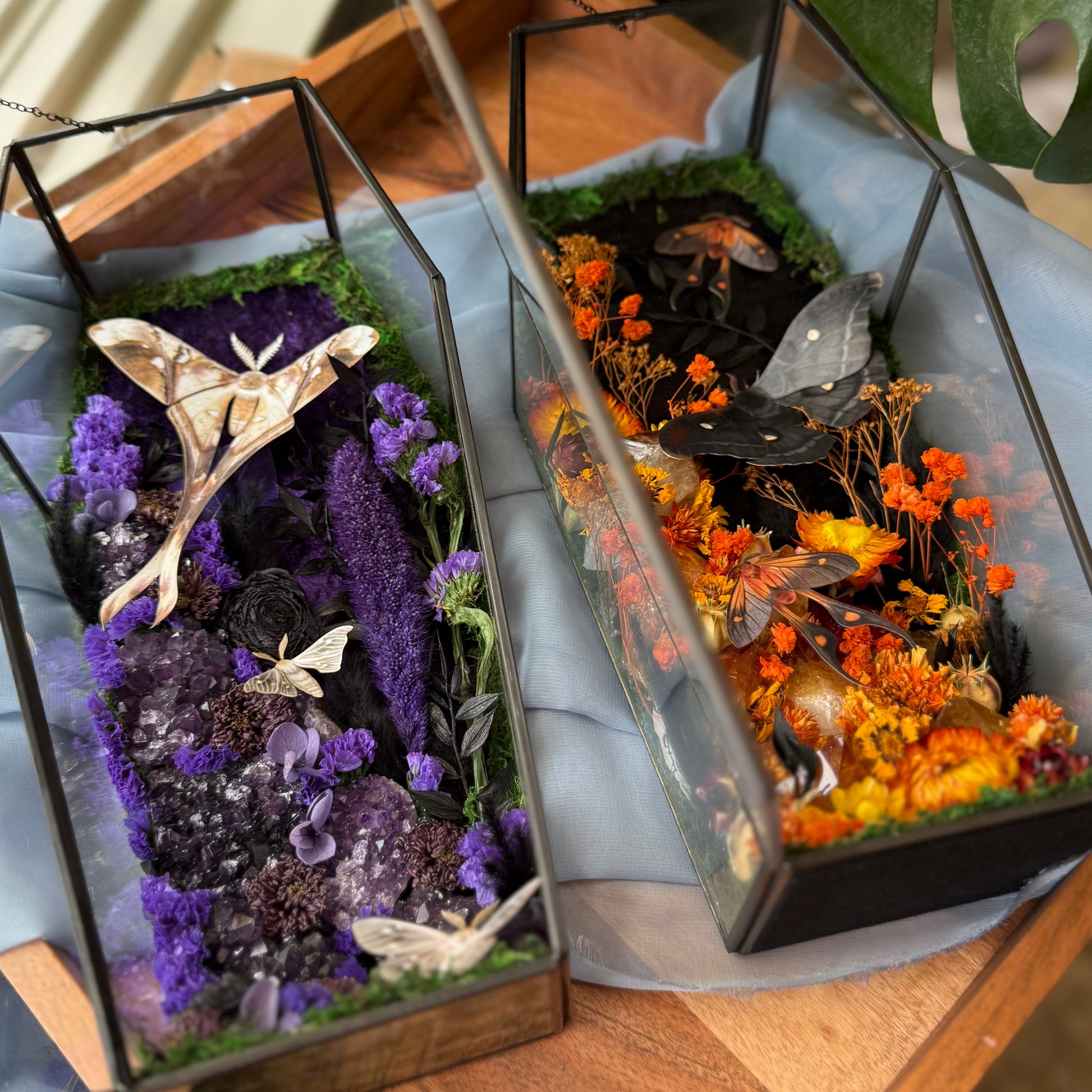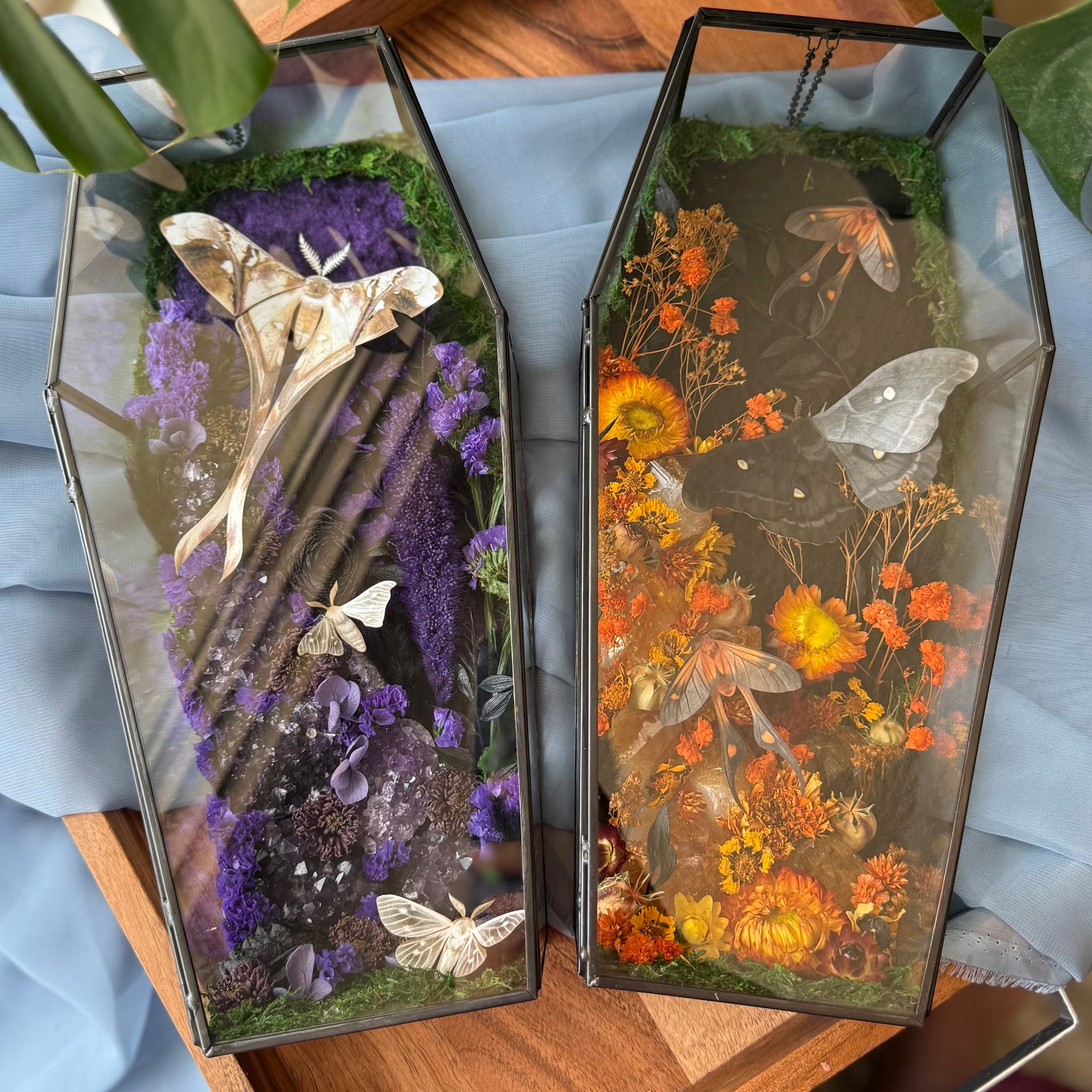 Preserved moss and dried florals tangle into an eternal autumn garden, where a hauntingly beautiful paper Dark Polyphemus moth rests beside two rare Fulveolans long-tailed burnet moths.