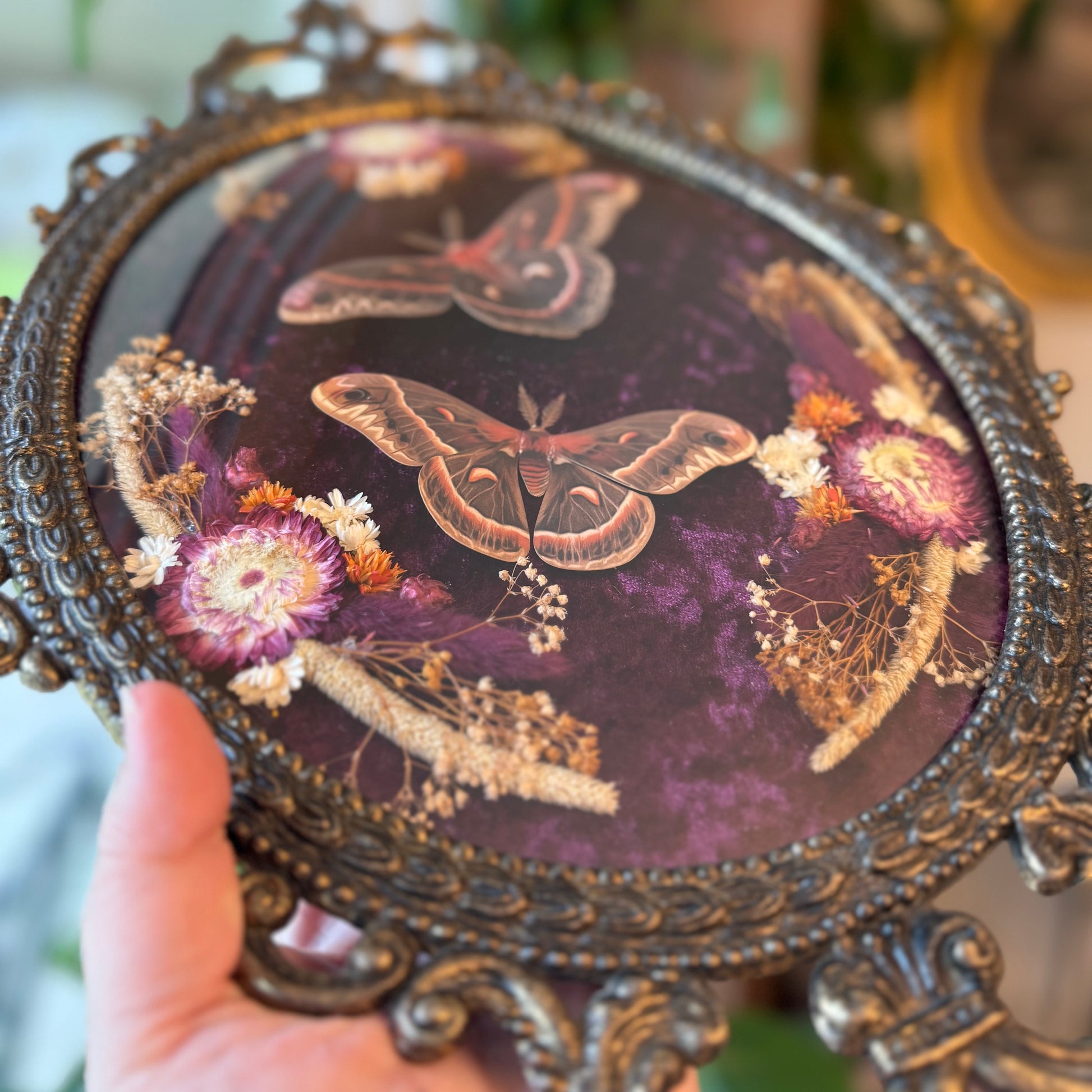 As always, my pieces are vegan, sustainable, and cruelty free. The Winged Garden collection focuses on repurposing vintage and antique photo frames with unique curved glass and giving them a new life to be cherished for years to come.