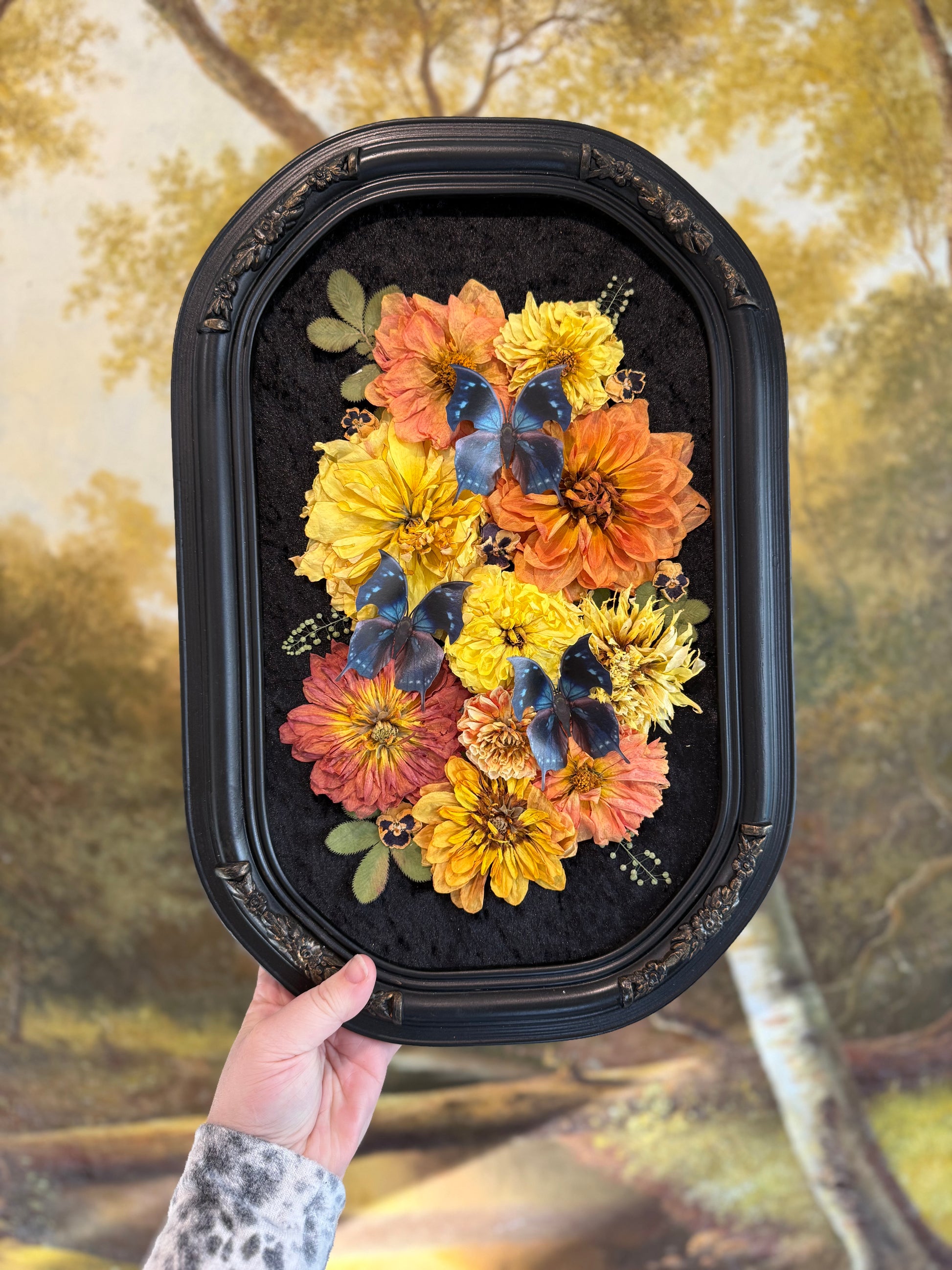 Housed in an antique refinished wood frame, a delicate paper blue hatchet butterflies rest among autumn dried florals, black crushed velvet backing, and behind curved bubble glass.