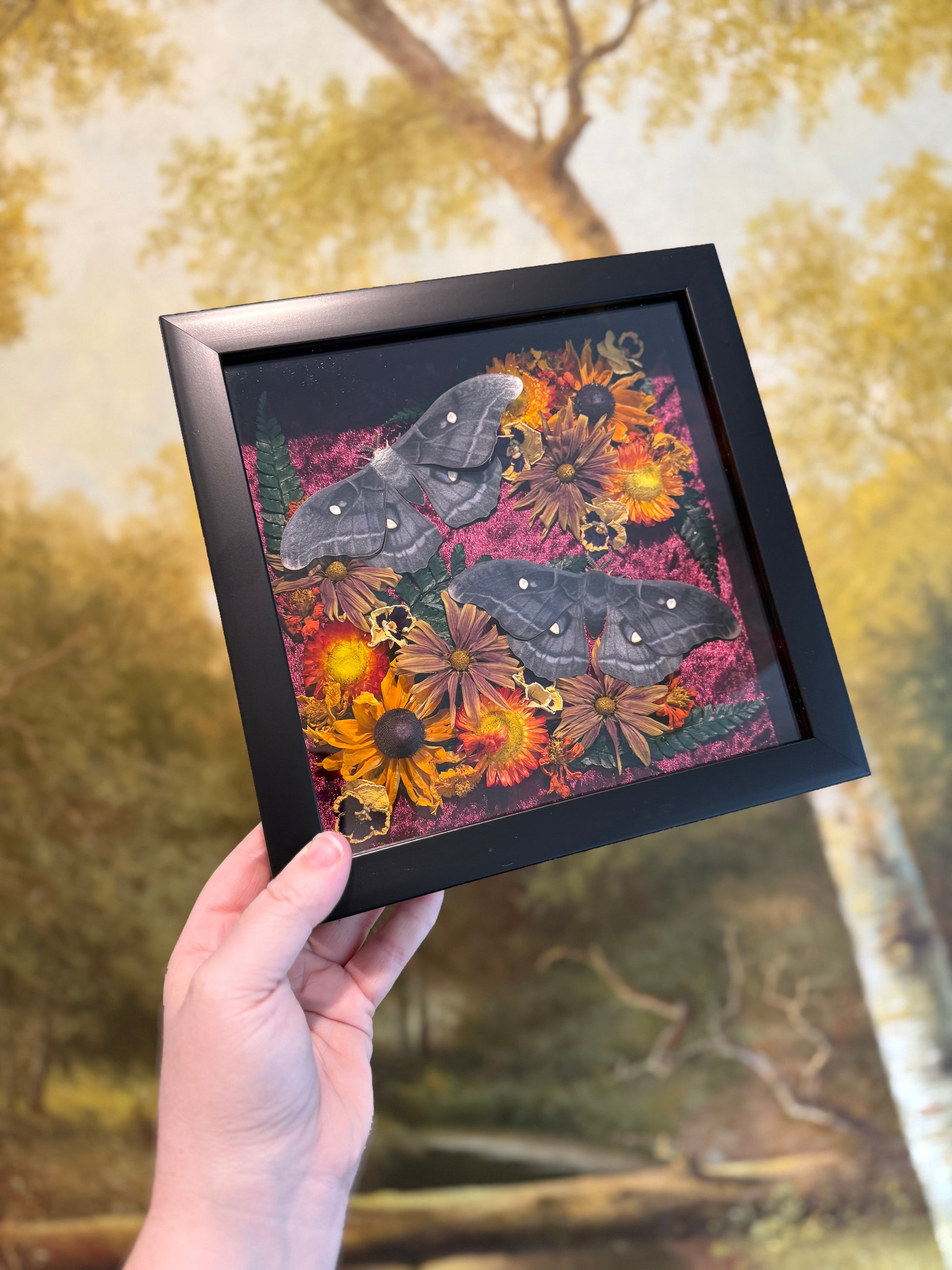 Housed in a black 8x8 wood frame, a delicate paper black Polyphemus moths rest among dried florals and red crushed velvet backing.