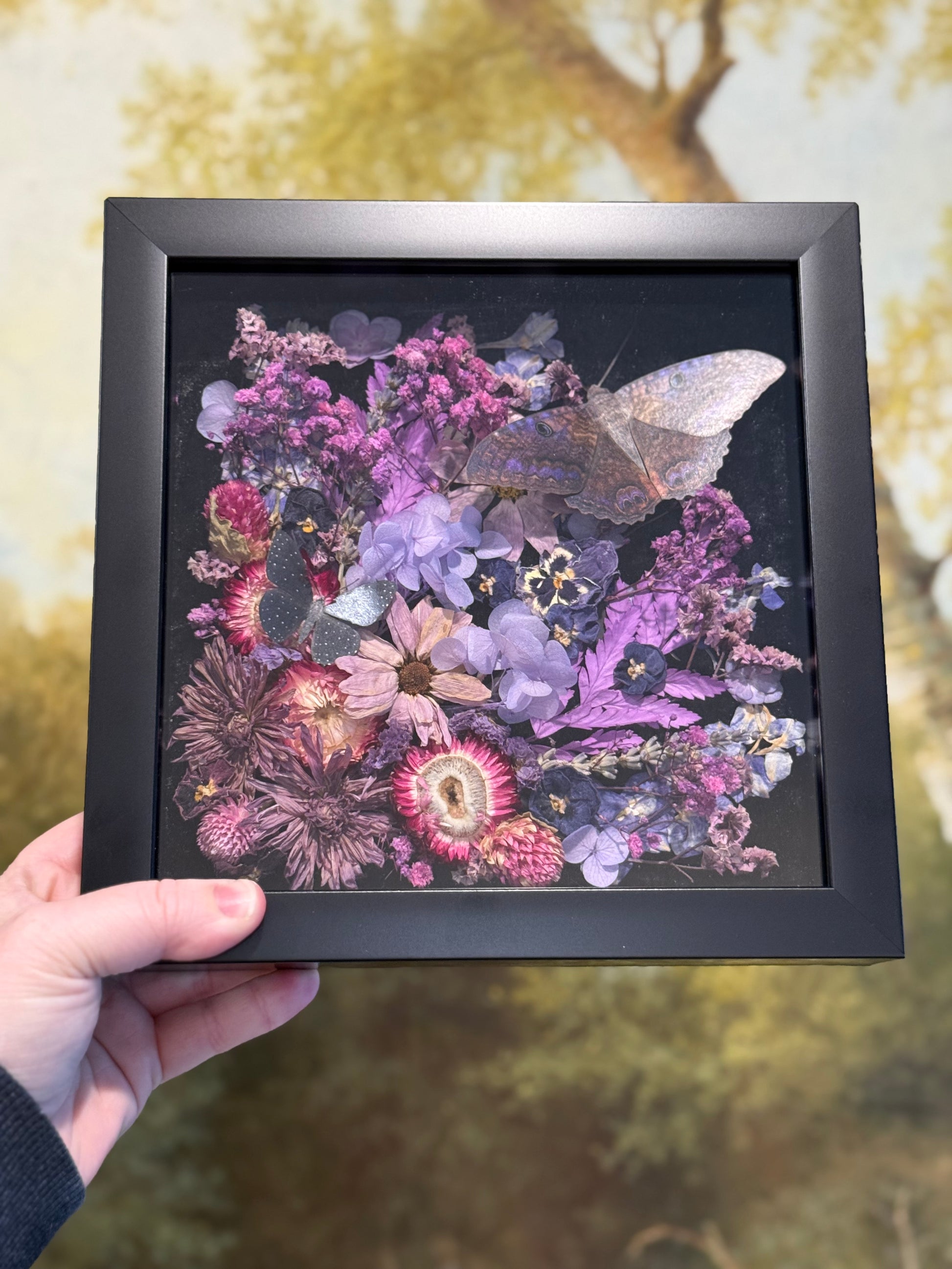 Housed in a black 8x8 wood frame, a delicate paper black witch moth rests among dried florals and black crushed velvet backing.