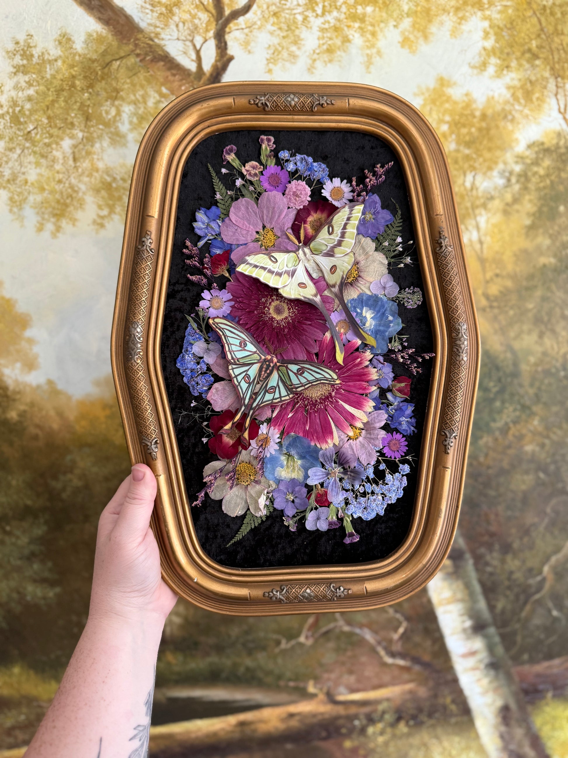 Housed in an antique wood frame, a delicate paper moon moths rests among dried florals, black crushed velvet backing, and behind curved bubble glass.